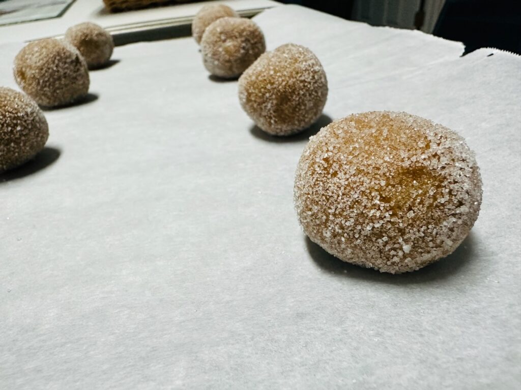 Roll dough into balls, around 1-1/2” in diameter, coat in sugar, and place 3 inches apart.