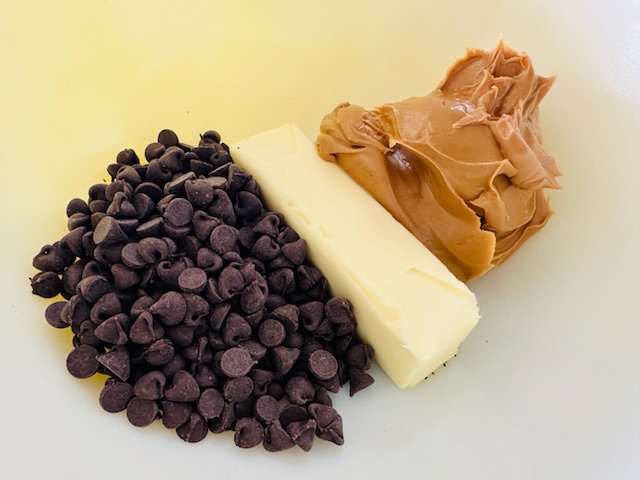 In a microwave-safe bowl, combine the chocolate chips, peanut butter, and butter. Microwave in 30-second intervals, stirring after each, until the mixture is fully melted and smooth.