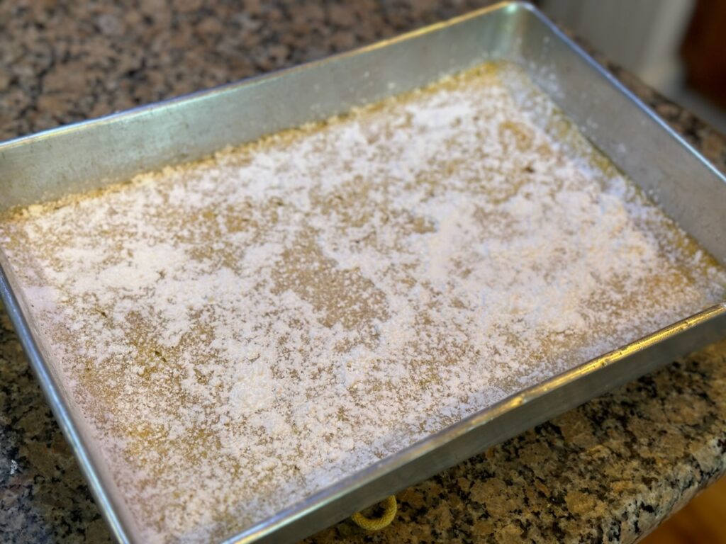 Heat oven to 350 degrees. Measure flour and blend thoroughly with melted butter and powdered sugar. Press evenly in an 8”x8”x2” pan. Bake for 15-20 minutes. Beat the rest of ingredients together and pour over the crust and bake 15-20 minutes more. DO NOT OVERBAKE. Allow to cool completely and dust with powdered sugar. Makes 16 squares. (The filling puffs during baking but flattens when cooled. May double for 9×13” or triple for jelly roll pan. No need to increase baking time.)