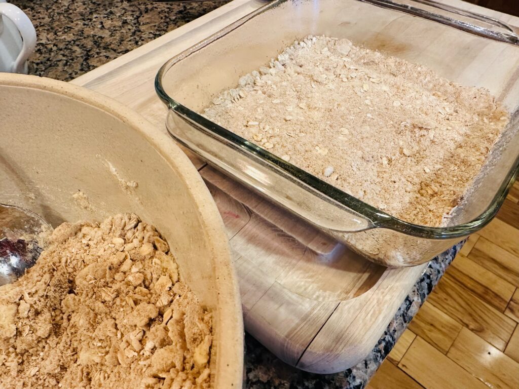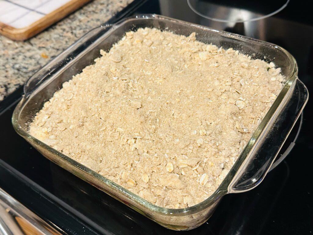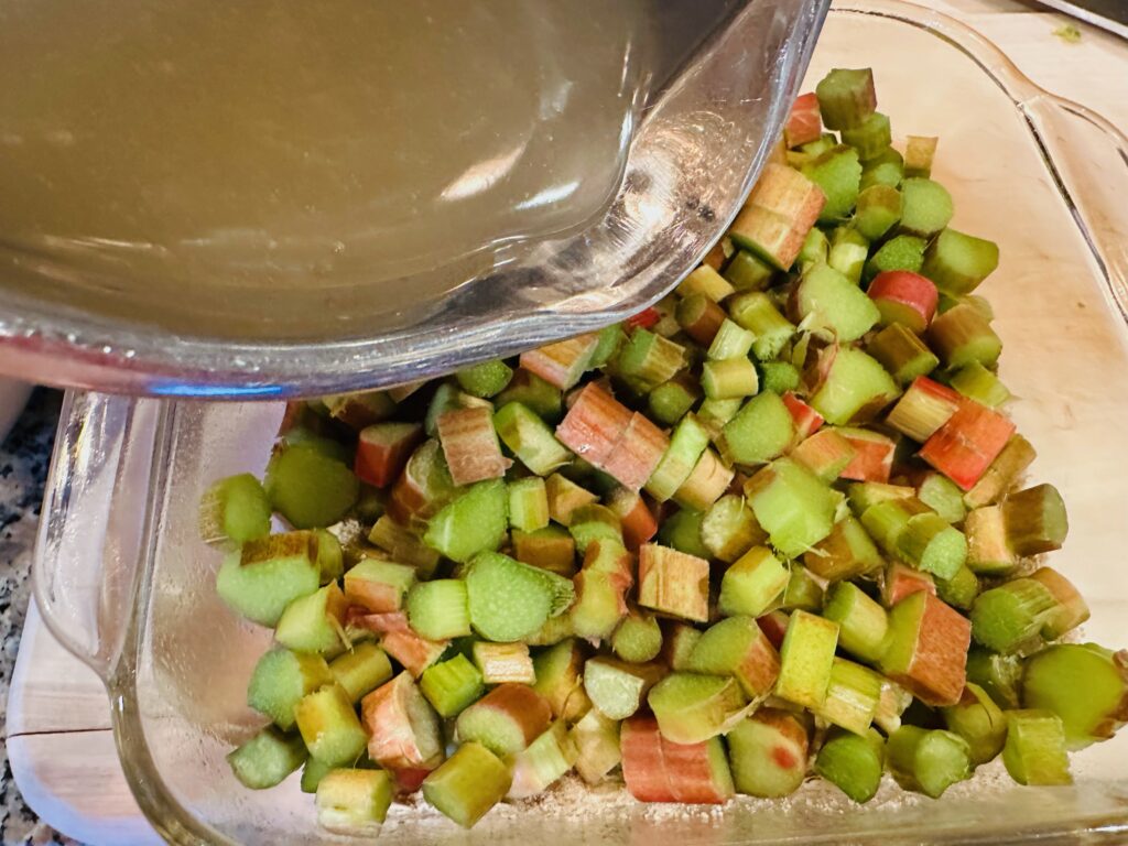 Meanwhile, mix flour, oatmeal, brown sugar, melted butter, and cinnamon until crumbly. Press half of the mixture into a greased 9×9-inch baking dish. Layer with rhubarb, then pour the cooked sauce evenly over the top. Finish by sprinkling the remaining crumb mixture over everything.