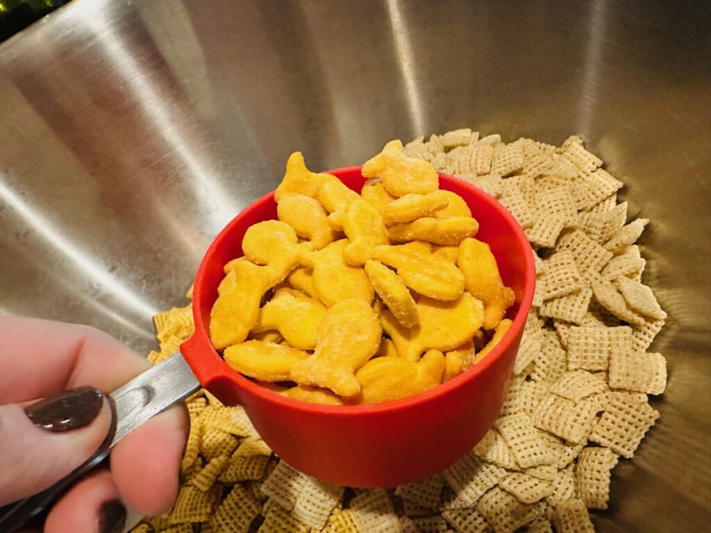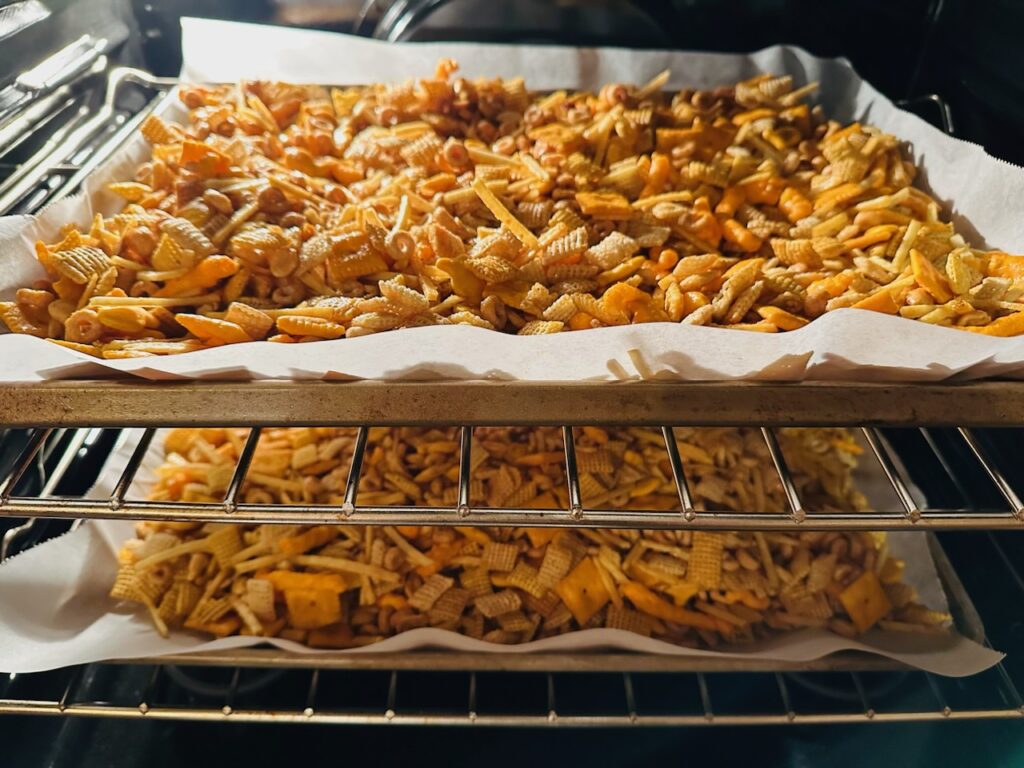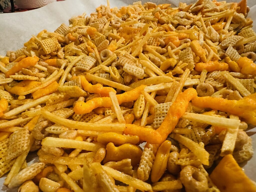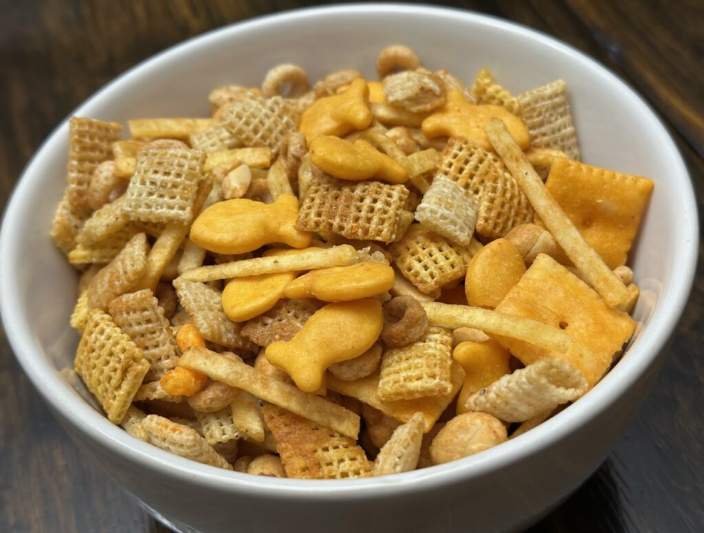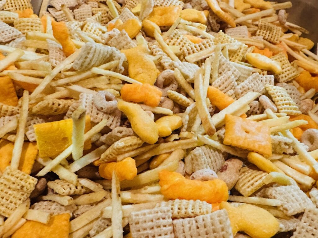 This snack mix is salty, savory, crunchy and packed with familiar flavors. Chex cereal, cheese crackers, Goldfish, peanuts and Cheetos all come together with a buttery, seasoned coating that bakes low and slow until everything is evenly coated and crisp.