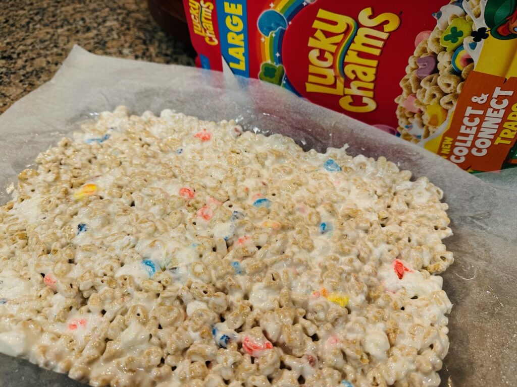 5. Remove from heat and gently fold in the Lucky Charms cereal until well coated.