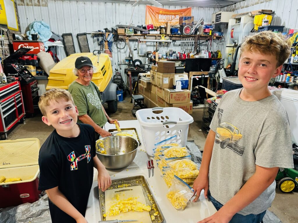 My husband and I make freezing sweet corn a priority so that we can enjoy it throughout the year. We feel that the home-grown flavor of the corn is superior to any grocery store options. This year we really streamlined our process by using a turkey fryer to boil the corn. From the boiling water, the corn was placed in icy water and then cut off the cob once cooled. My kids helped place the corn in the bags and got it right to the freezer.