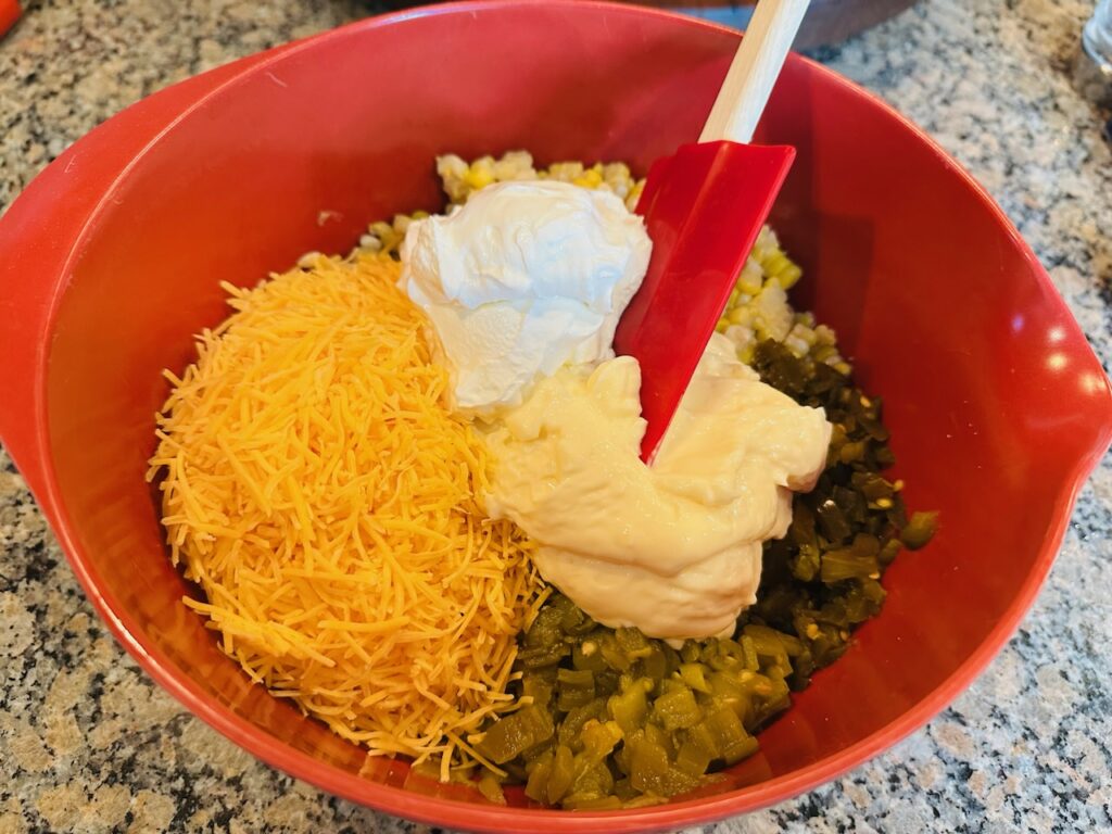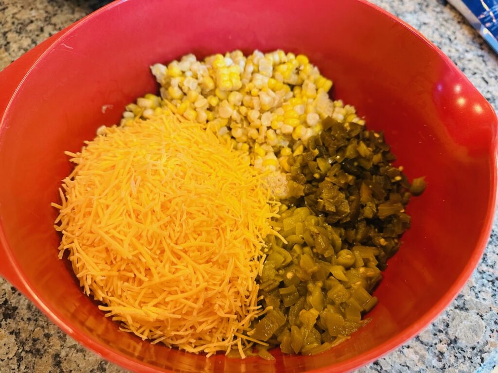 If using frozen corn, defrost and remove excess liquid before using. Mix all ingredients. Add the amount of cheese to your liking. Chill in the refrigerator for some time before serving. Serve dip cold with corn chips or tortilla chips.