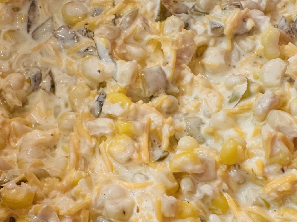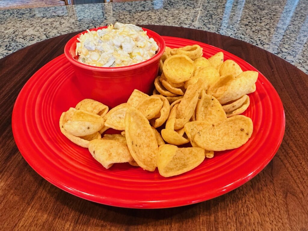 My recipe this week uses that homegrown sweet corn and transforms it into a both slightly sweet and savory dip that pairs perfectly with Fritos Scoops chips. Both fresh or frozen sweet corn can be used in this recipe, or even a canned variety will work. Of course, nothing is better than fresh summer sweet corn. This is sure to be a crowd pleaser for your next event.