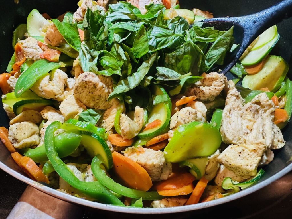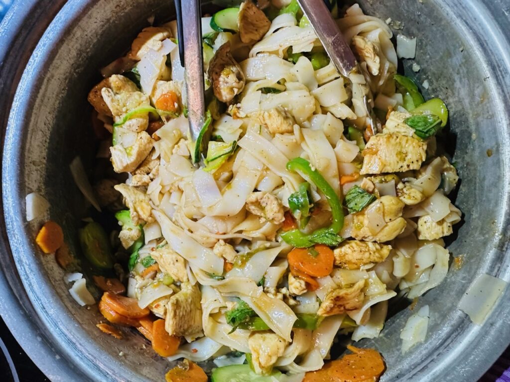 I really love the texture of the wide rice noodles in this dish. They’re tender and chewy, perfect for soaking up the sauce. Paired with flavorful vegetables, thinly sliced chicken and fragrant basil, every bite feels satisfying yet fresh. The sauce is what really ties it all together, with a mix of soy sauce, oyster sauce, fish sauce, chili paste and just a touch of brown sugar to balance it all out.