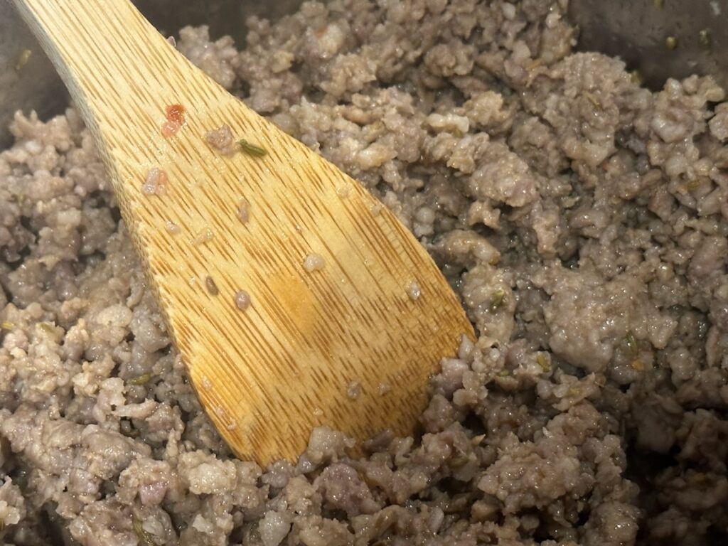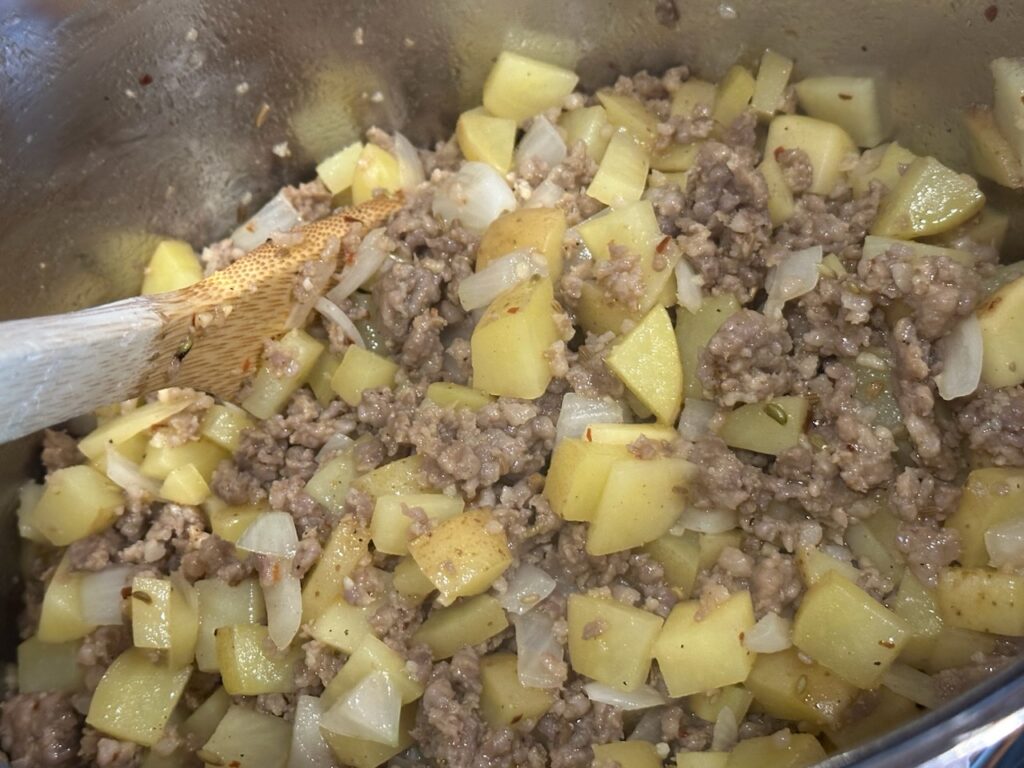 Chop potatoes (we kept the skin on) and onion. Brown Italian sausage, retain some grease for flavor, but remove any excessive grease. Mix onion in with sausage and sauté until onions are translucent. Add red pepper flakes and garlic and sauté for one additional minute.