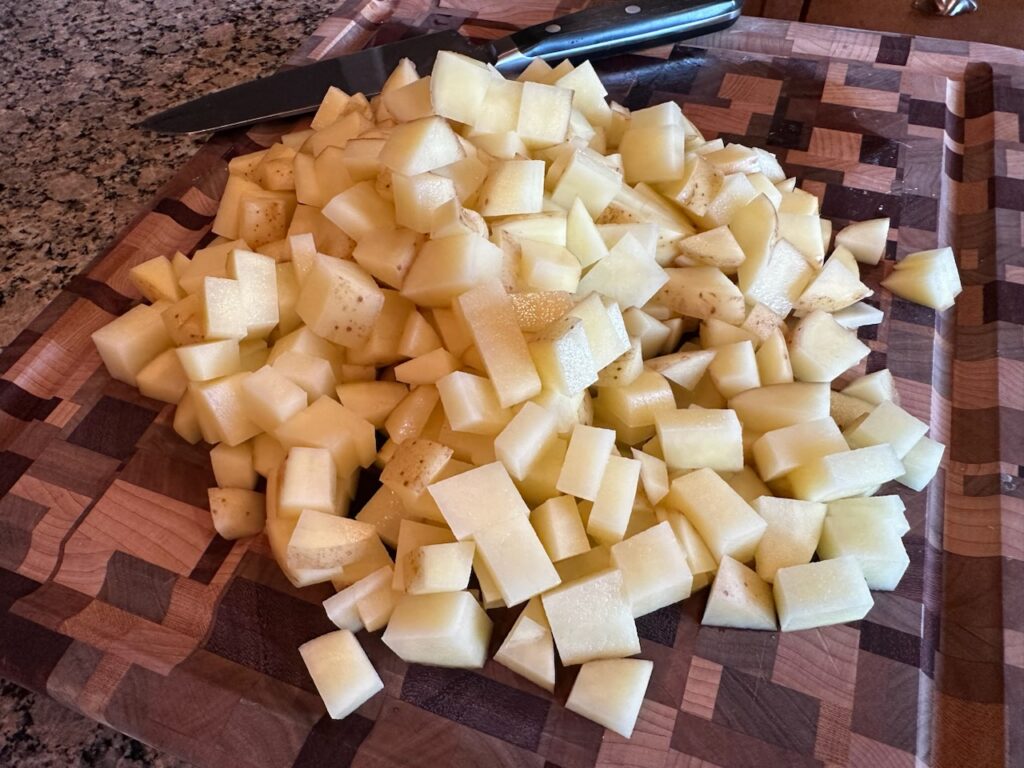 She decided that she would double the recipe due to the amount of people we would be feeding. She started out by chopping a mountain of potatoes. From there, she browned the sausage and then it came together quickly. It was done at the exact time I finished the chicken.