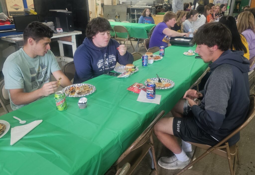 The students enjoyed a lunch of hamburgers, pork chops, salads, vegetables and of course, dessert. During the lunch, the bank representatives passed out gift bags filled with locally-purchased items such as cookies from the Downtown Eatery and Bakery and cupcakes from Karen Simms. In addition, each bag had a gift card from area restaurants.