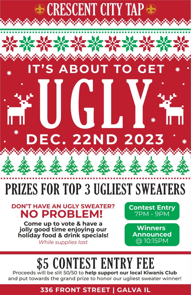 The Crescent City Tap in Galva, located at 336 Front St., will hold an ugly sweater contest on Friday, Dec. 22 from 7 pm to 9 pm. The theme is “it’s about to get ugly.”