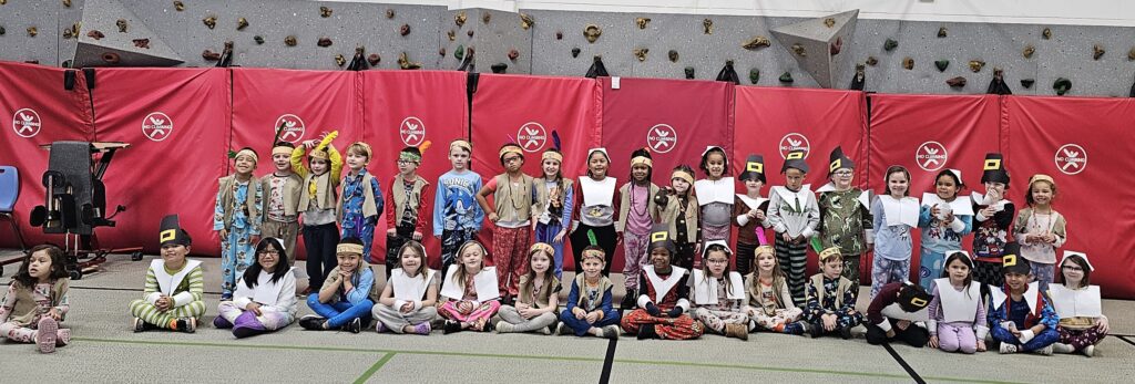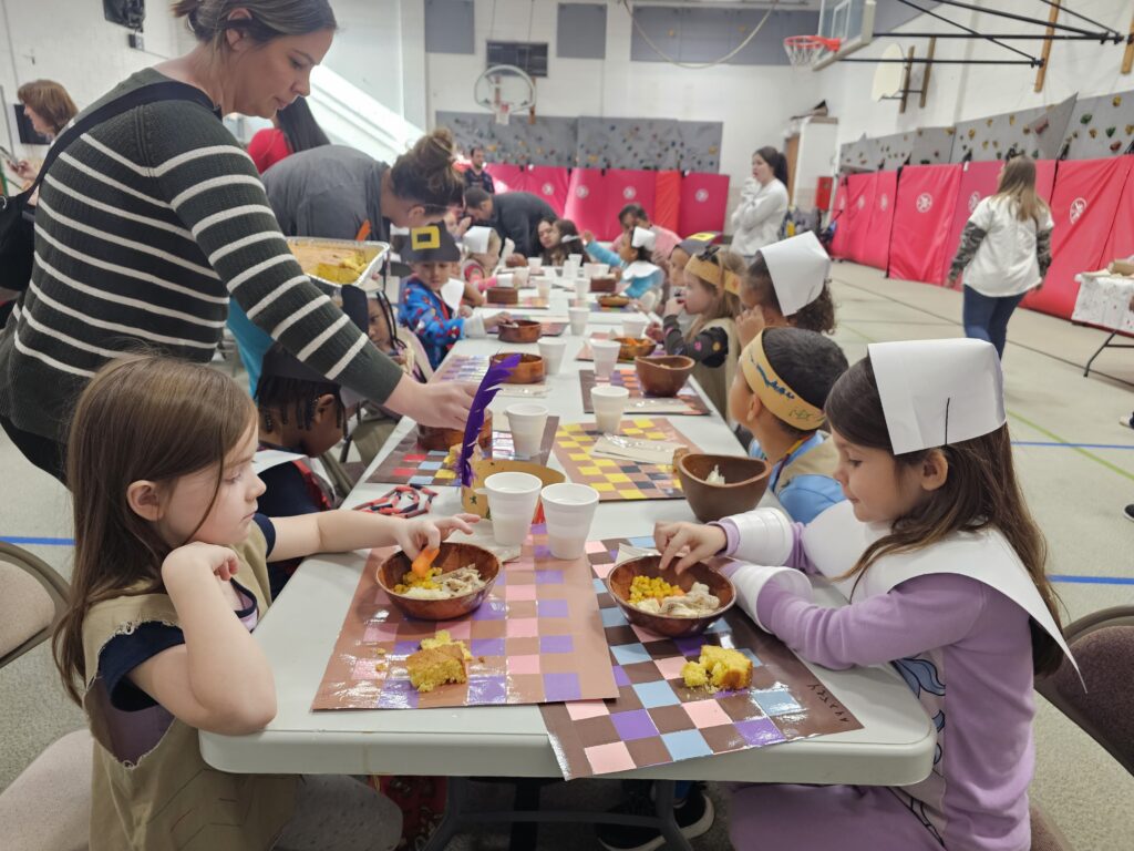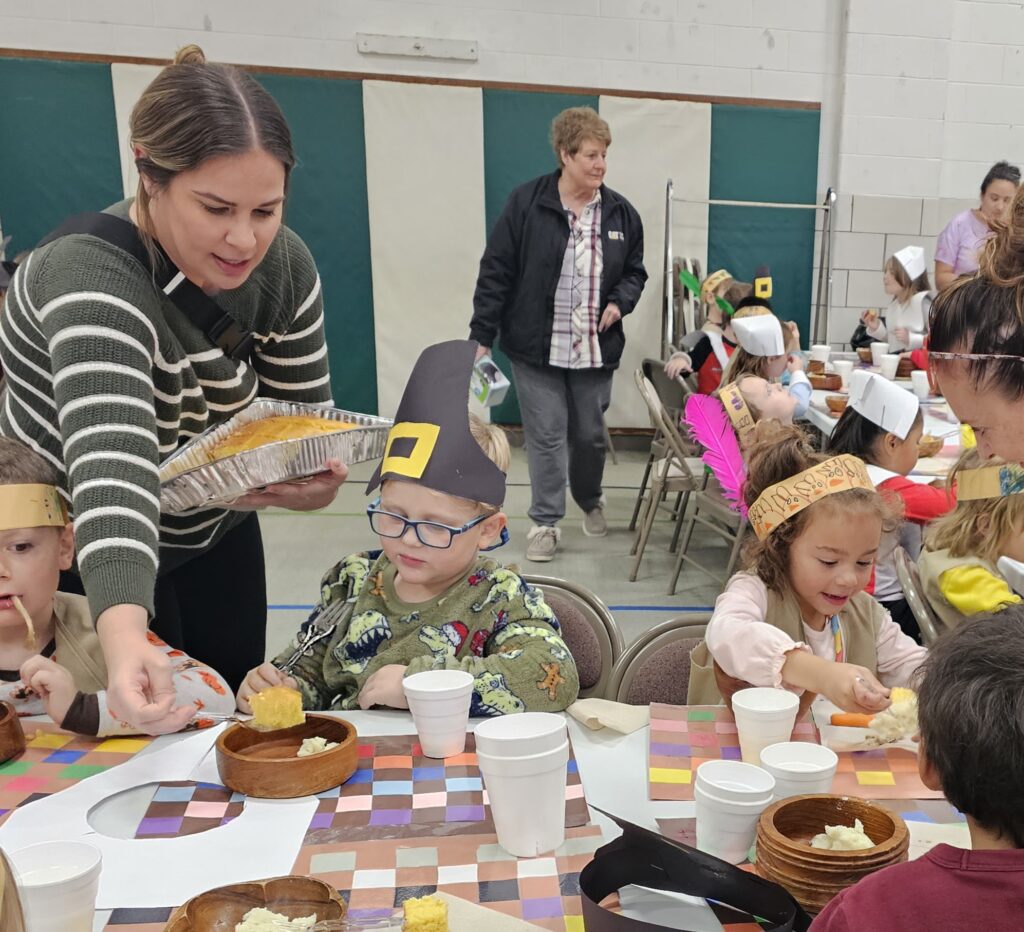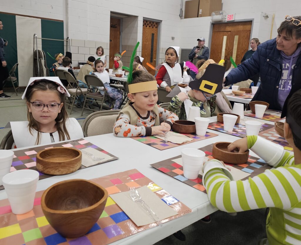 On Friday morning, the students spent time crafting their costumes that they would wear to the feast. Ms. Eastman’s class joined the feast, playing the role of Native Americans, while Mrs. Gomez’s class made pilgrim cuffs, collars and hats. Part of the morning activities included the students making small pumpkin pie desserts.