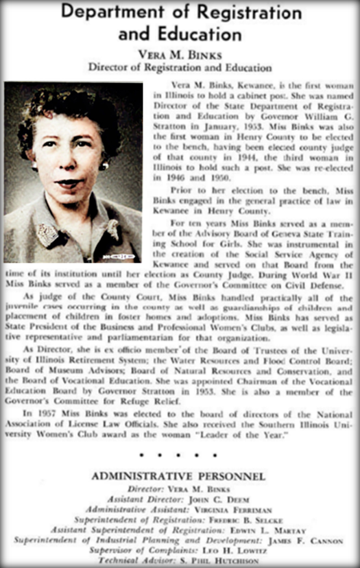 In 1952, then Governor William G. Stratton asked Vera to join his administration, and in January 1953, Vera became the Director of Illinois Department of Registration and Education, the first woman to hold a cabinet post in Illinois.