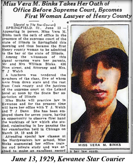 After a short time working in another office, Vera began working for Kewanee attorney T. J. Welch. Enjoying being associated with legal work, she began taking a correspondence course in law. When Welch learned about Vera’s interest, he offered to give her exposure to real casework.