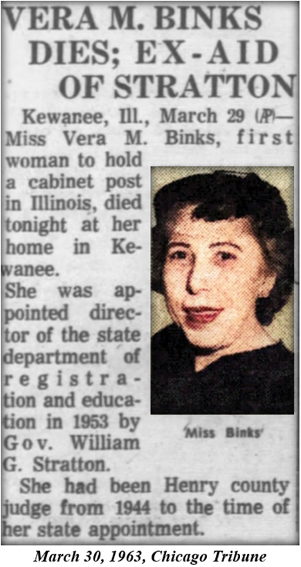 Overall, Vera served seven years in the Republican administration of Gov Stratton until she became ill in 1960. Vera told a Star Courier reporter that even though she was able to handle her duties by working at home, she still hoped to return to Springfield. But she cautioned the reporter, “I hope you don’t say I’m running business from my bedside . . . I’m up and around the house.” Unfortunately, her illness ultimately prevented her from returning to work.