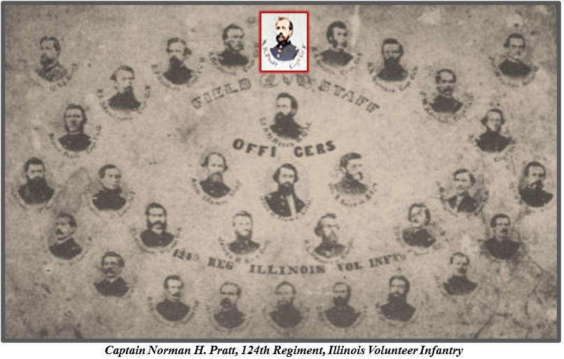 Norman H. Pratt came to Wethersfield from New York in the 1840s. He eventually became a commission salesman. When President Lincoln called for additional enlistments in mid-1862 during the Civil War, Pratt was one of many Wethersfield and Kewanee citizens to sign up, and he was elected as a lieutenant a company of Kewaneeans which eventually became part of the 124th Regiment of the Illinois Volunteer Infantry. After the Vicksburg siege in 1863, Pratt was promoted to captain.