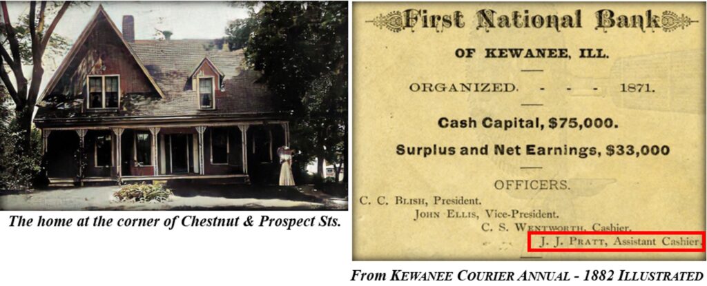 Junius Pratt, known as “June,” lived with his siblings, parents, and Grandfather Sloan on the northwest corner of Chestnut and Prospect Street. (A house in which E. E. Baker later lived and then tore down for his LaVilla mansion.) June Pratt attended local schools with other Kewaneeans his age, including George R. Parrish, who lived just down the block from him. Both he and Parrish spoke at their 1875 commencement exercises for their high school graduation from Kewanee’s “Old Academy.”