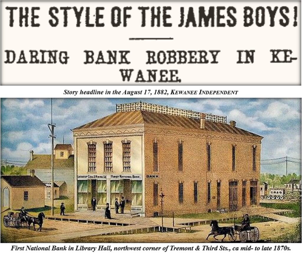 Meanwhile, 1882 was also an eventful year back home in Kewanee. The Kewanee Independent reported that on Monday, August 14, 1882, “[t]he whole town was electrified at about 7 o’clock P. M. . . . by the hurried news that the First National Bank had been robbed of a large sum of money, and that the robbers . . . had safely escaped with their plunder. . . . [S]oon collected an excited crowd about the bank building, who . . . rapidly armed for the pursuit of the thieves. The sight of Mr. June Pratt, assistant cashier, and Miss Charrie Palmer, lady clerk, both wounded and bleeding, from the rough treatment received at the hands of the villains, intensified the excitement, and the large crowds of citizens hastily gathered together what firearms could be found and started in hot, but unorganized pursuit.”