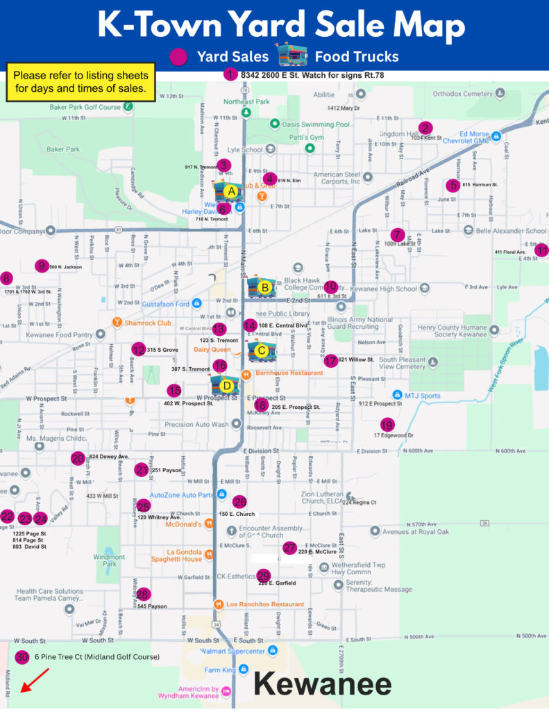 Paper copies of the K-Town Yard Sales map, listing locations of Kewanee yard sales and Saturday’s food trucks will be available starting on Tuesday.