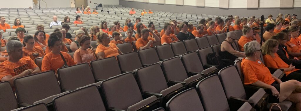 Wearing orange and black, some 200 KEA members attended Monday’s school board meeting.
