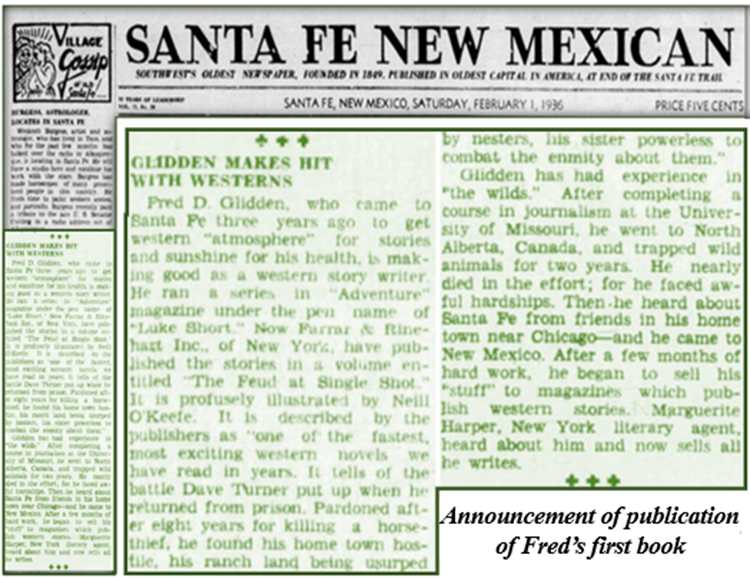 Fred began submitting Western stories to the “pulps” (low-grade magazines of fiction) while living in Santa Fe. He met Marguerite E. Harper, who became his literary agent until she died in the 1960s. Harper was a significant influence on his writing career, and she suggested the pen name “Luke Short.” It’s unknown whether this was a reference to the real-life gambler-gunfighter Luke Short.