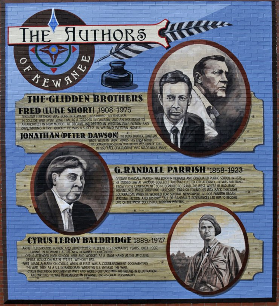 In 2013, a Walldogs’ mural was dedicated to honor four famous Kewanee authors, Fred Glidden, Jonathan Glidden, G. Randall Parrish, and Cyrus Leroy Baldridge. Fred was a well-respected writer of stories of our West, and deserves all honors bestowed on him.