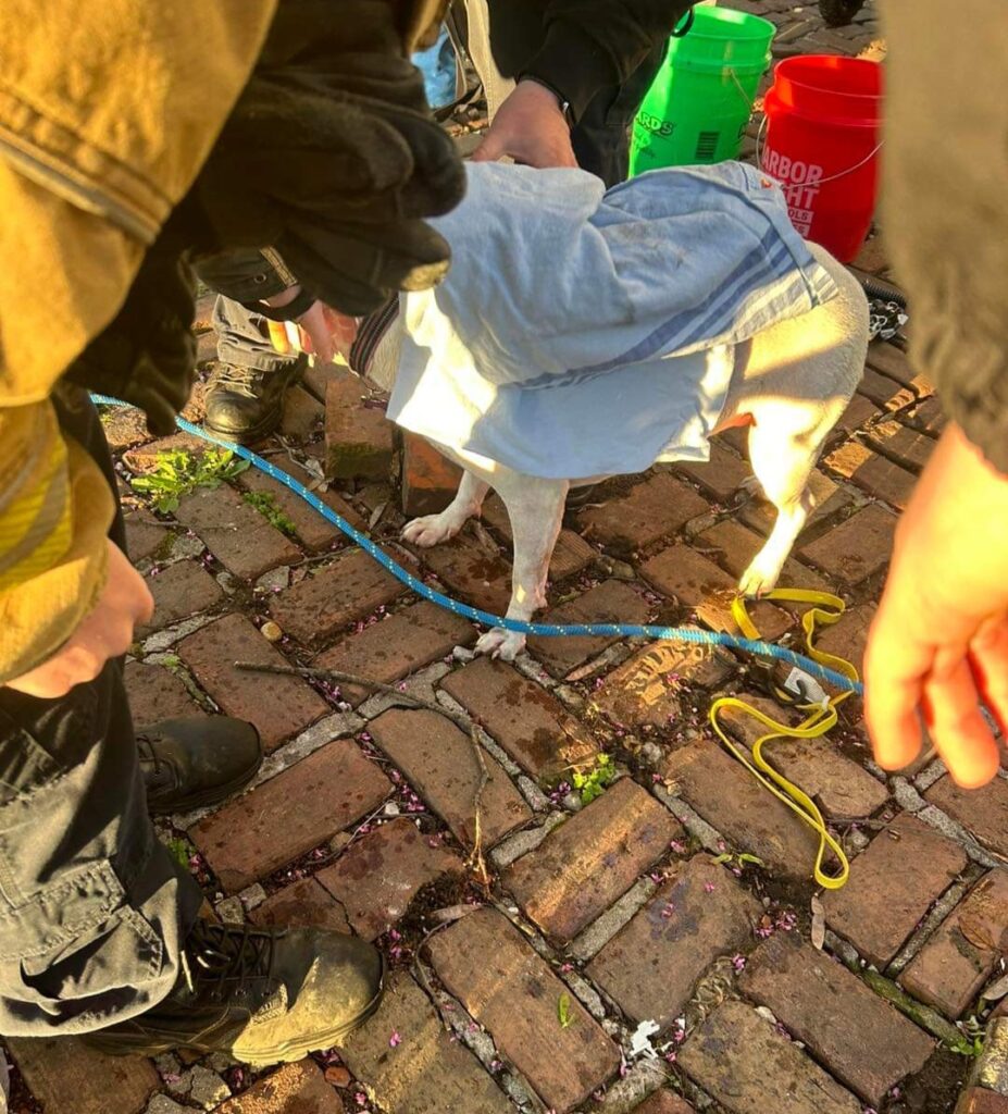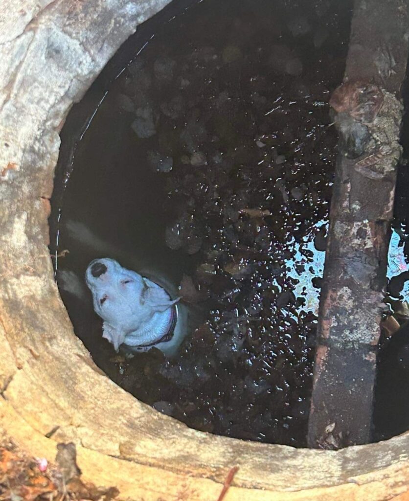 When crews arrived on the scene Friday morning, they found a “very friendly and cold pit bull in a cistern.”