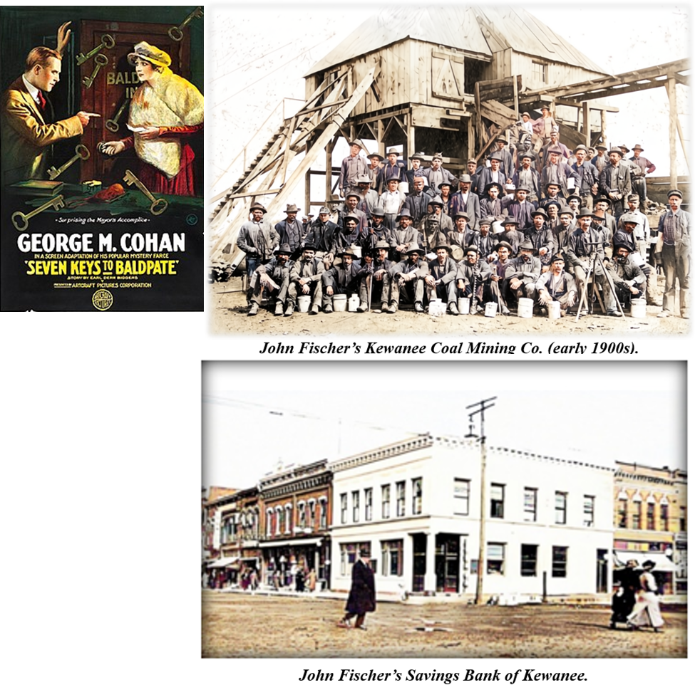 In 1889, Fischer began in the real-estate loan business, and in 1890, purchased stock in the First National Bank, where he eventually became a director and vice-president. During this time, he also operated the Kewanee Coal and Mining Co. east of town on Kent Road. In 1902, Fischer organized and became president of the Savings Bank of Kewanee, known as the “White Bank,” on the northeast corner of Tremont and Second Streets.
