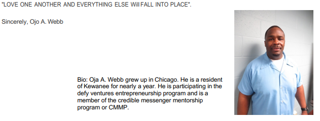 Webb also grew up in Chicago and has been a resident of Kewanee for nearly a year. He is participating in the Defy Ventures Entrepreneurship Program and is a member of CMMP. His essay focuses on what freedom means to him personally.