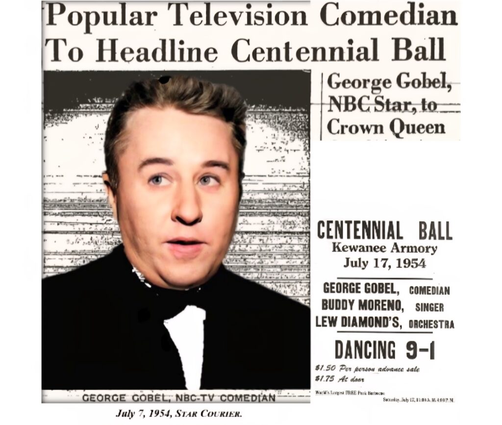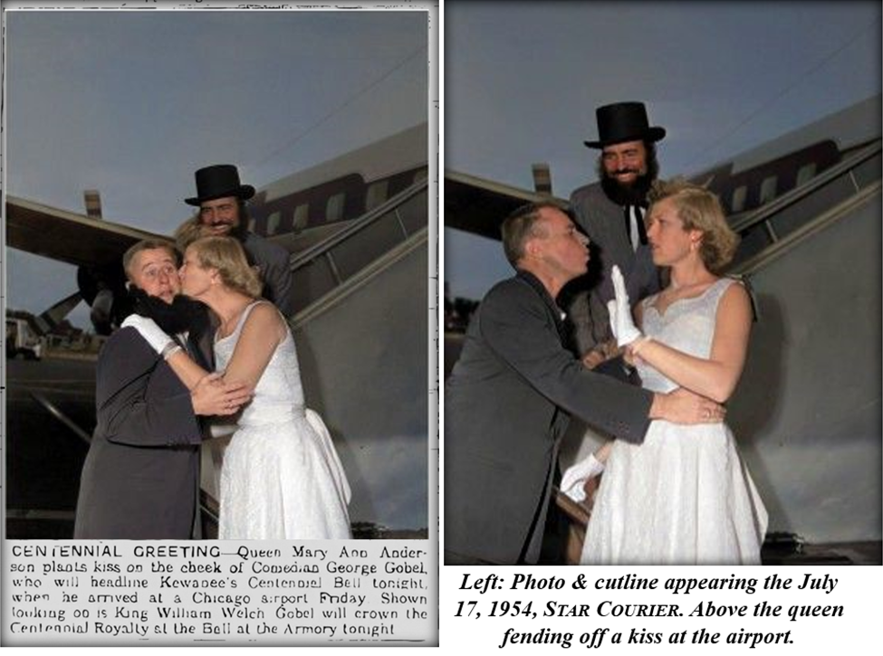 Gobel arrived by plane in Chicago on the Friday night before the ball. He was met by Centennial Queen Mary Ann Anderson, King Bill Welch and a reported 200 Gobel fans. Anderson adorned Gobel with a set of false whiskers and feigned and real exchanges of kisses ensued. Gobel then drove to Kewanee with his friend Buddy Moreno.