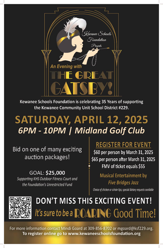 Kewanee Schools Foundation is gearing up for “An Evening with The Great Gatsby” event to be held at 6 p.m. on Saturday, April 12, at Midland Golf Club in Kewanee.