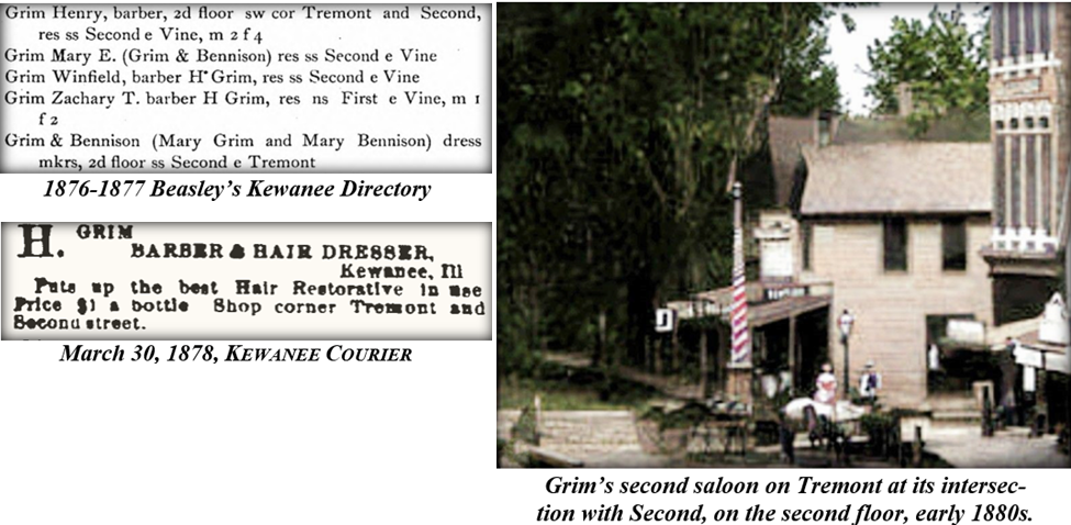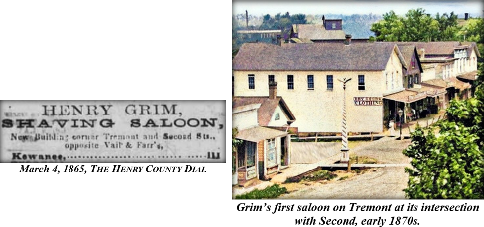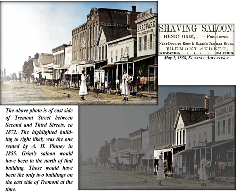 Henry Grim set up his barber and shaving saloon in one of the first two buildings put up on the east side of Tremont between Second and Third streets, available at a reasonable price due to the muddy conditions along Tremont. His family lived above the saloon on the second story of the building (at today’s 214 N. Tremont St.). The other building then on Tremont was next door to the south where J. H. Pinney and his brother operated a grocery store (at today’s 212 N. Tremont St.).