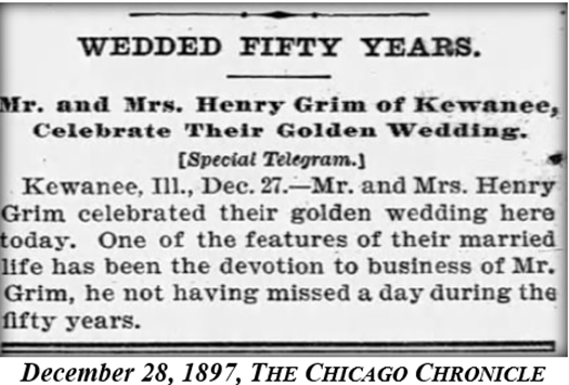 Henry Grim died at a daughter’s home in 1899 in Kewanee, a year after his wife died and only days before the calendar turned to the 20th century. He was survived by five of his children, one living in Colorado, three in Iowa and one in Kewanee.