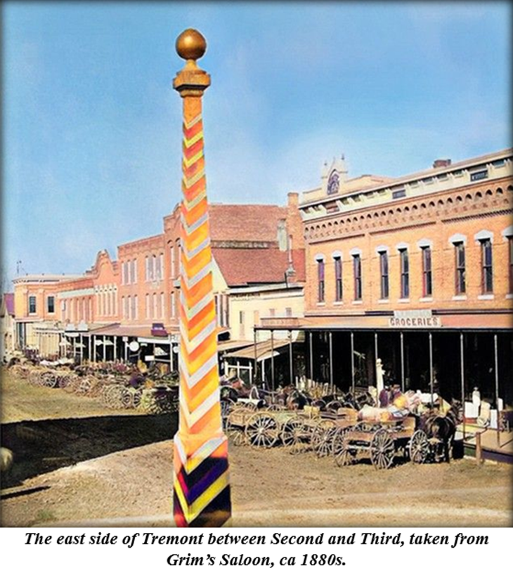 By 1876, the one-story building at Tremont and Second was replaced by a two-story structure, and Grim’s saloon was located on the second floor. He also manufactured hair switches and curls, and a hair restorative.