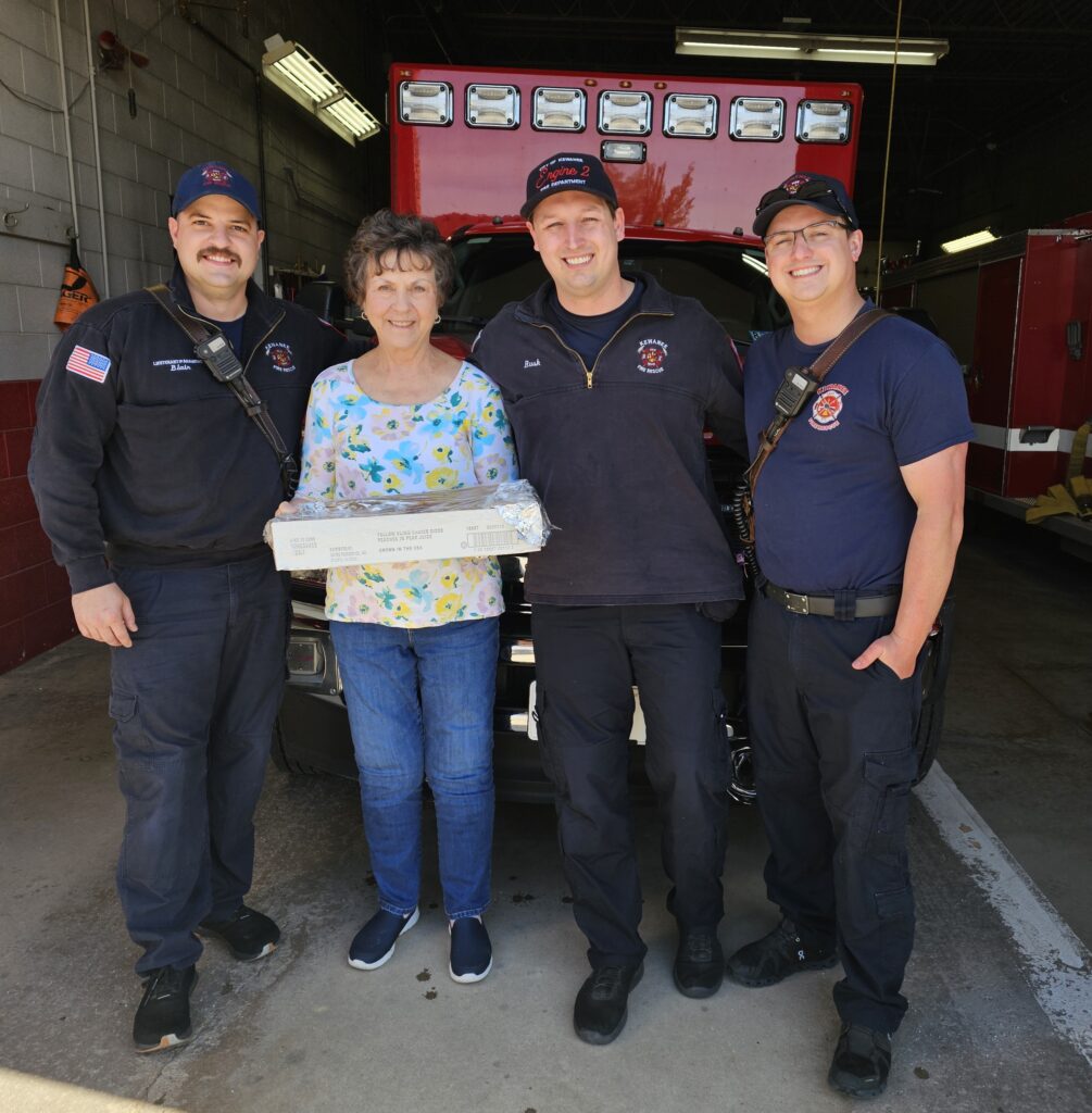 Fire Station 2 got a treat for May Day. From left, Kyle Blair, Women’s Guild member Linda DeVilder, Greg Rusk and Andrew Welgat. [Photo by Susan DeVilder]