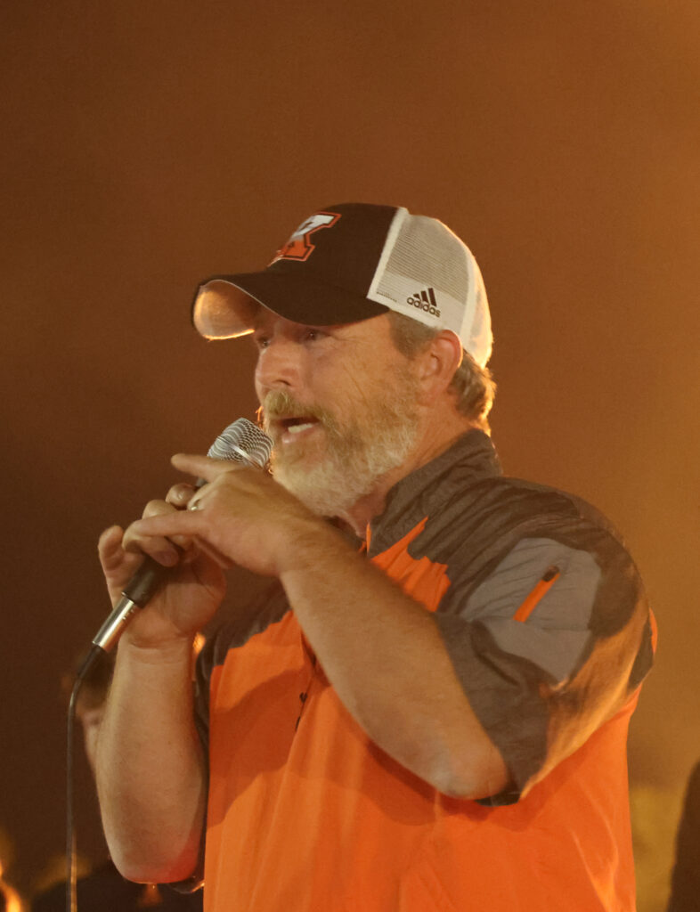 Head football Coach Matt Taylor addresses the crowd at the bonfire.