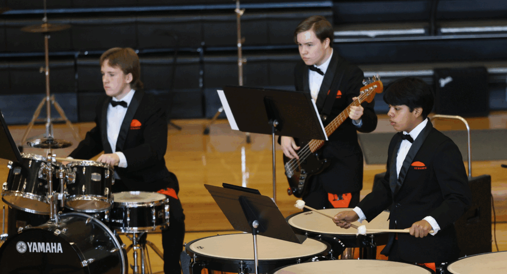 Percussionists perform with the band.