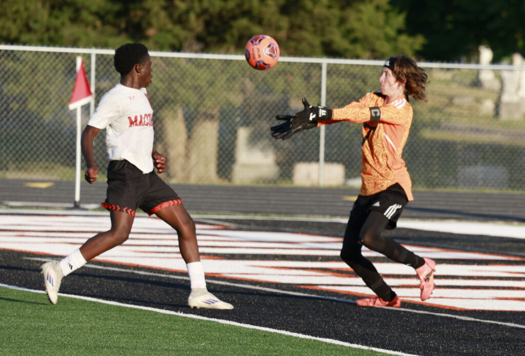 Kewanee’s Dillon Price makes a save during the game against Macomb. [Photo by Mikey Gamez of the Kewanee Voice Student Journalism Program]