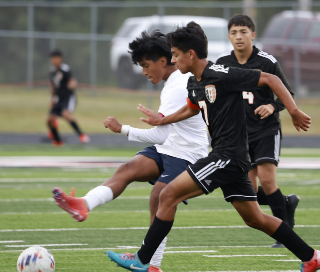 Kewanee’s Michael Bermudez battles with a Monmouth player for the ball. [Photo by Liz Rivera of the Kewanee Voice Student Journalism Program]