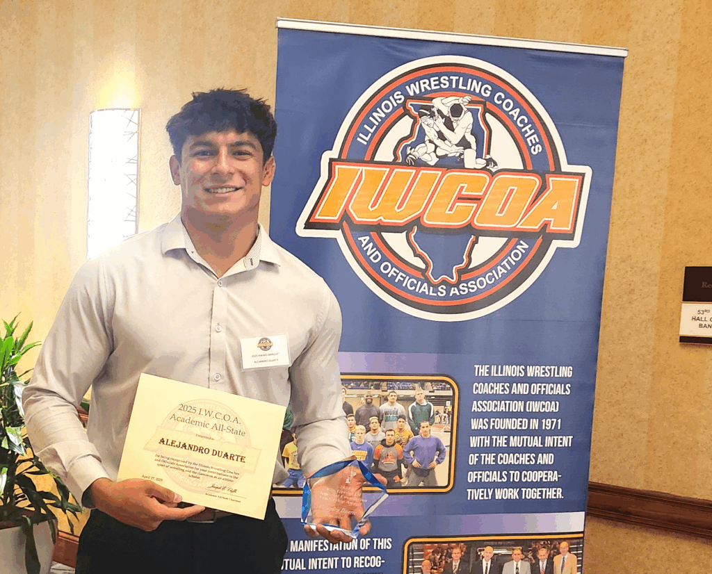 Alejandro Duarte was awarded the Ken Gerdes III Memorial Foundation Leadership Award on Sunday at the Illinois Wrestling Coaches Officials Association Banquet in Alsip, Ill. Duarte received a check for $1,000 to use towards his college education.
