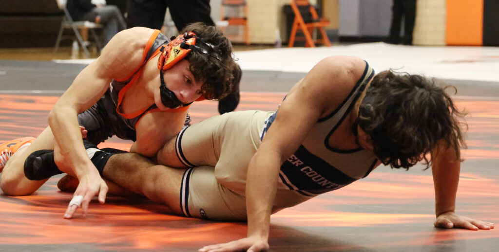 Ace LaFollette in action against a Mercer County wrestler at 175 pounds. [Photo by Liz Rivera with The Kewanee Voice Student Journalism Program]