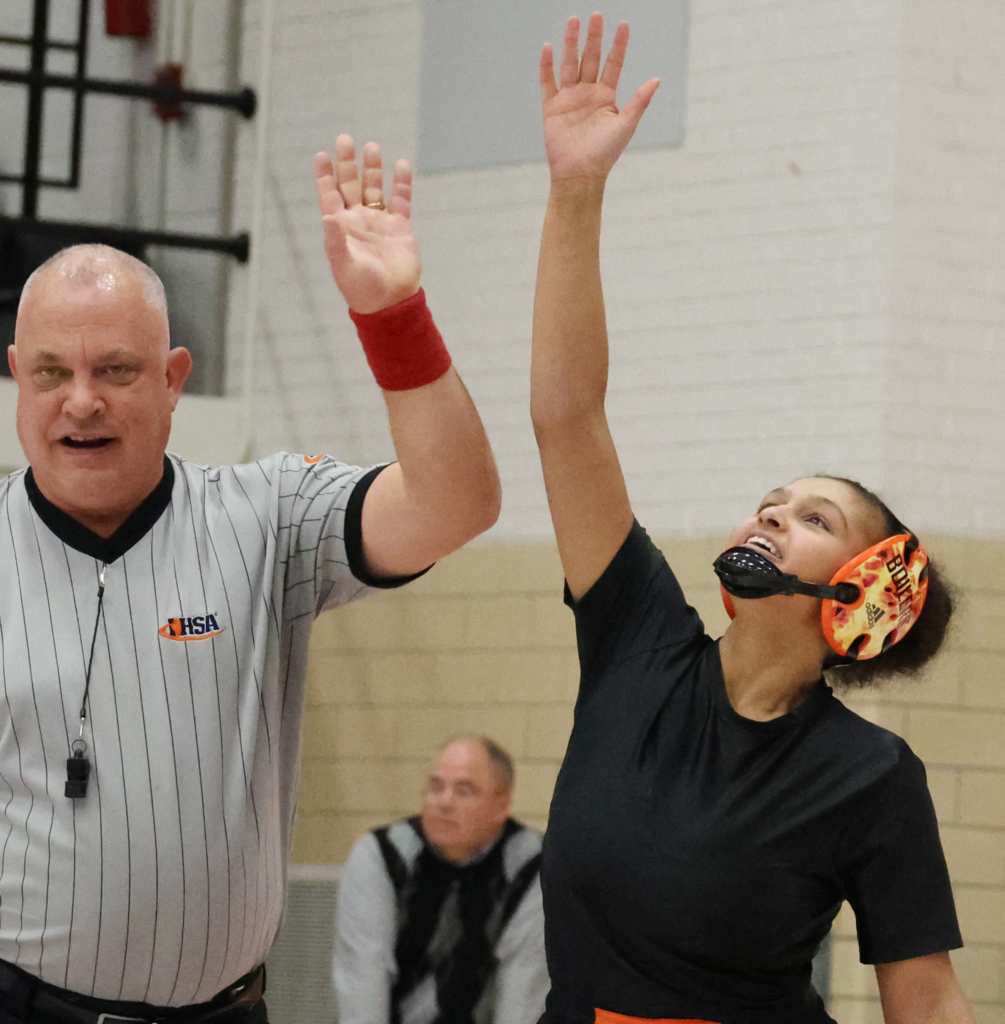 Ra’Kiya Amos raises her hand after winning her match. [Photo by Kristina Quanstrom with The Kewanee Voice Student Journalism Program]
