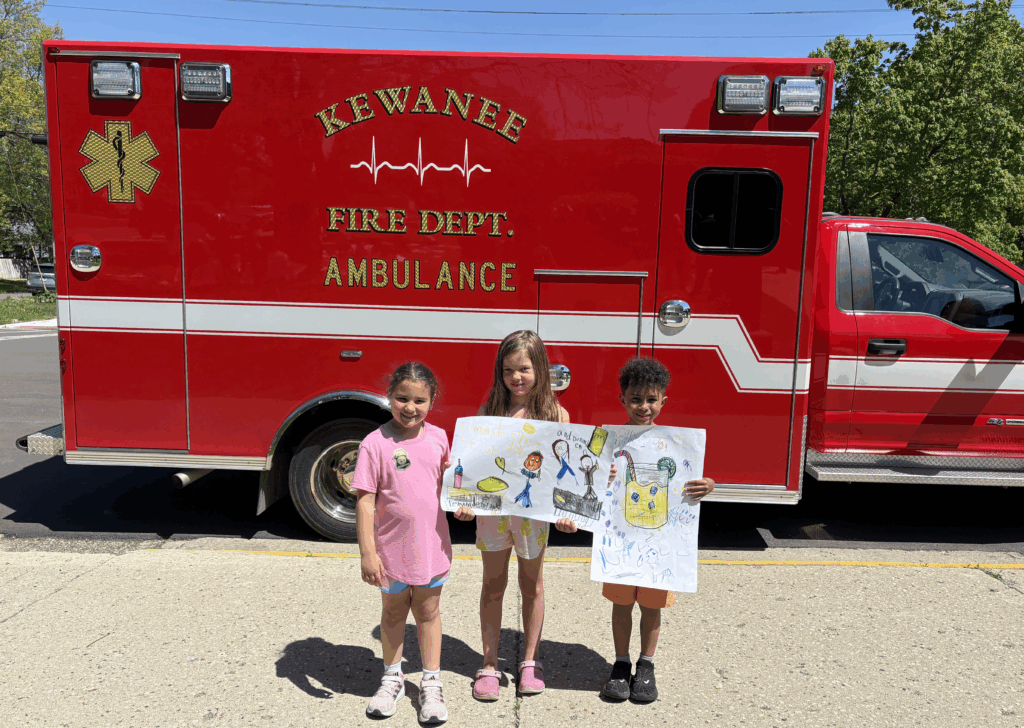 Kindergarteners Ava Shipley, Ellie Peach and Micah Davis hold lemonade stand signs in front of the ambulance. [Photo by Kendall Vincent]
