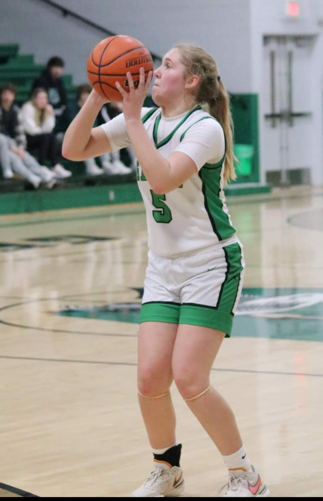 Paige Huffman squares up to launch a 3-pointer. Huffman made five threes on the night and scored 16 points. [Photo by Marlie Lindstrom of The Kewanee Voice Student Journalism Program]