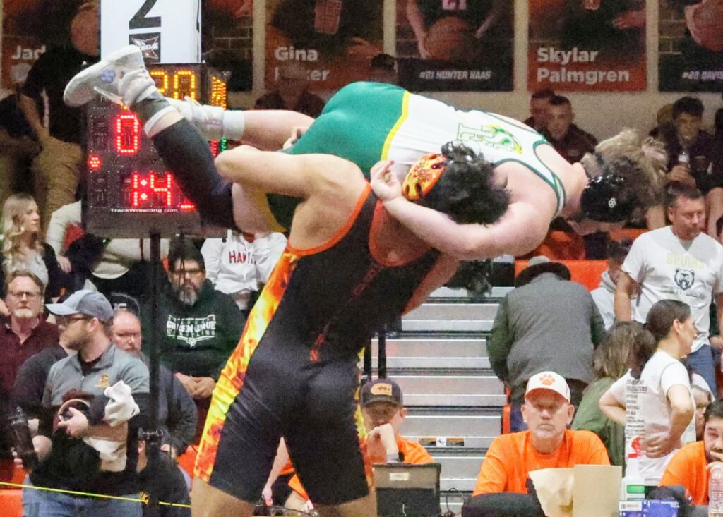 In the third place match (and a trip to the state meet on the line), Aiden Fisher’s fate was quickly determined. Fisher, (38-11) of Orion, was pinned by Duarte in just 23 seconds.