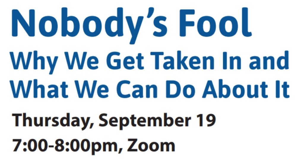 To find out more, people are invited to attend a talk with Professor Dan Simons from the University of Illinois, co-author of “Nobody’s Fool: Why We Get Taken In and What We Can Do About It.”