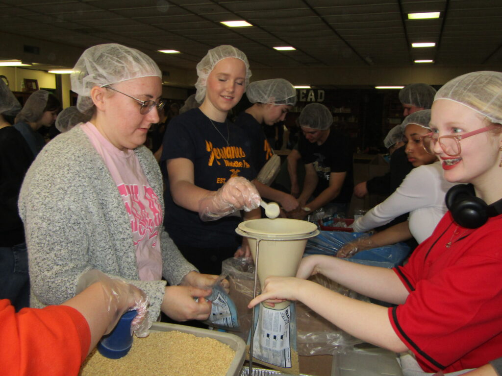 FFA members Section 3, which includes high schools in Henry, Bureau, Stark, Mercer and Rock Island counties, divided into groups and manned stations around the room where they filled packages with ingredients which were then placed in boxes to be shipped to hungry children around the world.