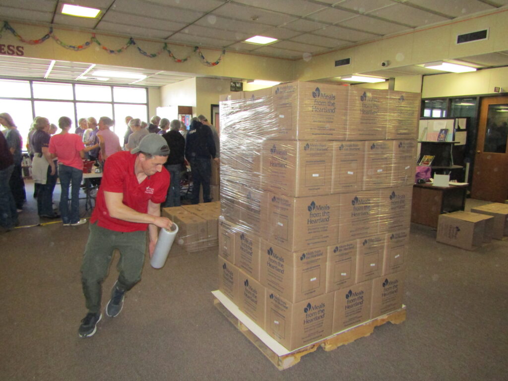 Meals from the Heartland team member Ryan Garvey runs around a pallet filled with boxes of food ready for shipment with a roll of cellophane. [Photo by Dave Clarke]