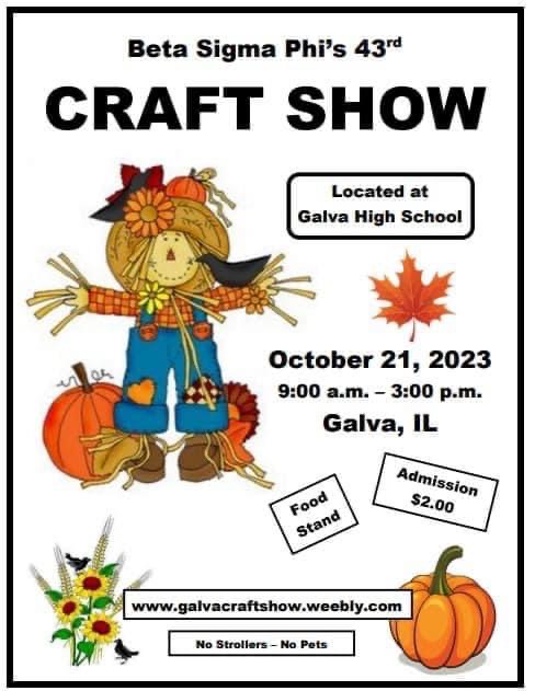 -Take in a craft show. The Beta Sigma Phi sororities of Galva will host the 43rd annual event at the Galva High School from 9 am until 3 pm on Saturday, Oct. 21. Browse over 80 vendors for handmade and crafted items. A homemade BBQ lunch that includes a sandwich, chips, drink and a homemade dessert will also be offered. The proceeds of the craft show will be donated back into the community.