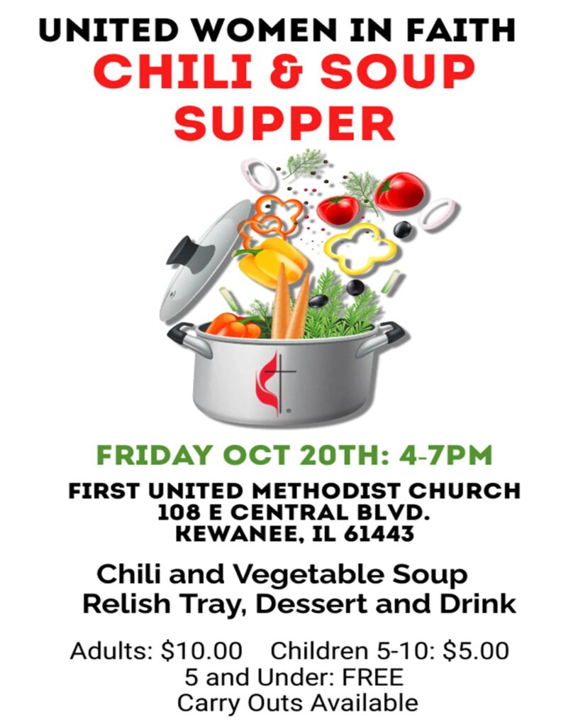 -Warm up and get a hot bowl of chili at the Kewanee First United Methodist Church fundraiser. The chili supper will be held at the church on Friday, Oct. 20 from 4 to 7 pm. The dinner is sponsored by the United Women in Faith and includes chili or vegetable soup, a relish tray, dessert and a drink. The cost for adults is $10 and children 5-10 eat for just $5. Carry outs are also available.