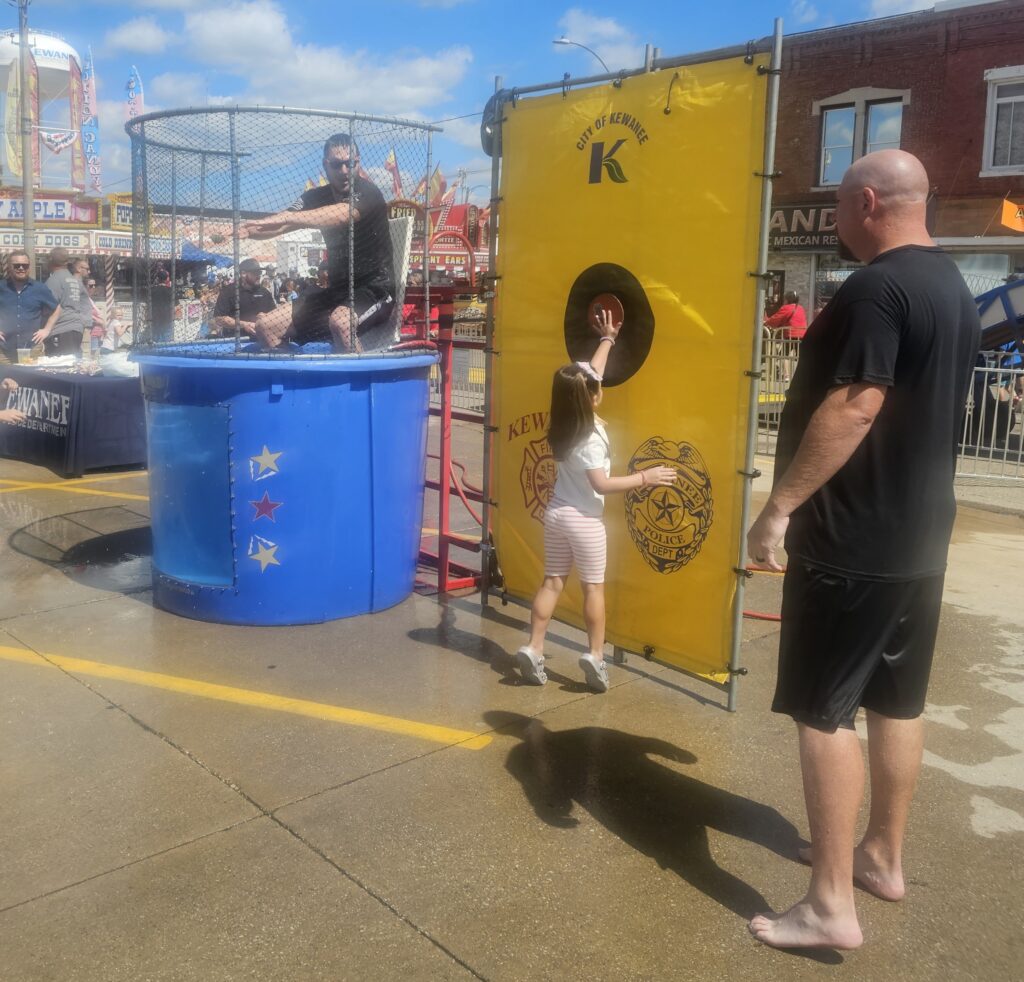 Kewanee police officers took their turn in the dunk tank, an annual attraction at Hog Days Kids Day. [Photo by Susan DeVilder]